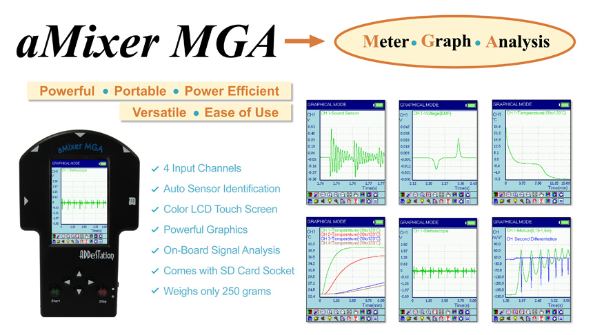 Powerful, Portable, Power Efficient, Versatile, Ease of Use. 4 Input Channels, Auto Sensor Identification, Color LCD Touch Screen, On-Board Signal Analysis, SD Card Socket, Weighs only 250 grams.