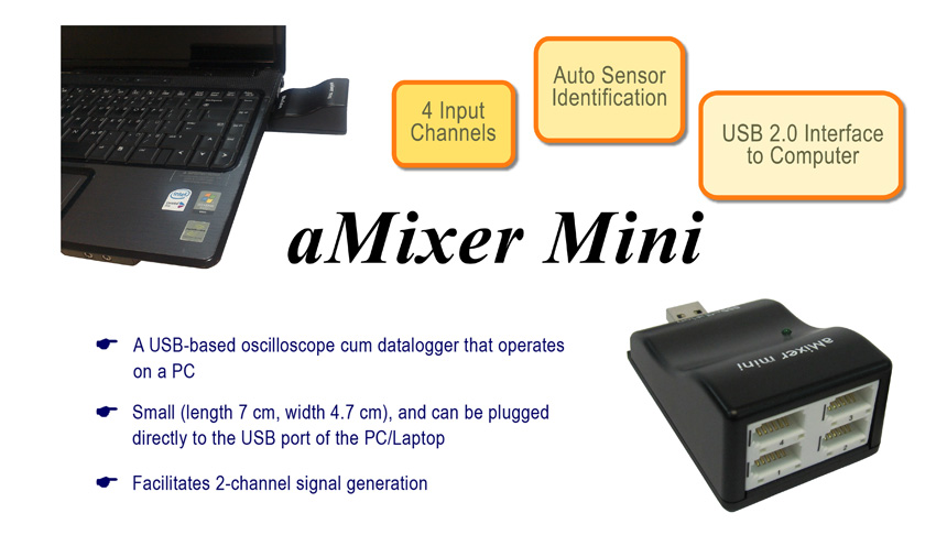 A USB-based oscilloscope cum datalogger that operates on a PC. Small (length 7 cm, width 4.7 cm), can be plugged directly to the USB port of the PC/Laptop. 4 Input Channels, Auto Sensor Identification, USB 2.0 Interface to Computer. Facilitates 2-channel signal generation.