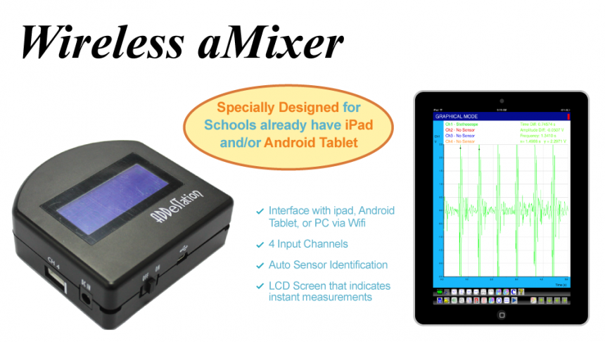 Interface with iPad, Android Tablet, or PC via Bluetooth. 4 Input Channels, Auto Sensor Identification, LCD Screen that indicates instant measurements. Specially Designed for Schools already have iPad and/or Android Tablet.