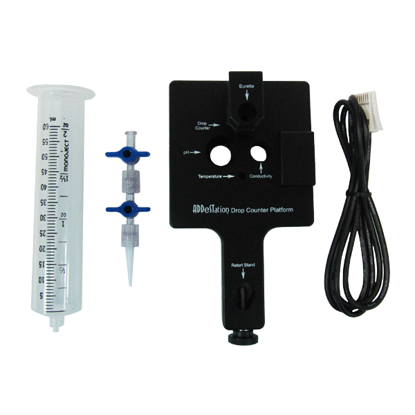 This Drop Counter Platform is able to count the number of drops of liquid falling from a burette. It is specially designed to house neatly several sensors such as pH Sensor, Temperature Sensor and Conductivity Sensor as well as a burette to facilitate titration experimentations.